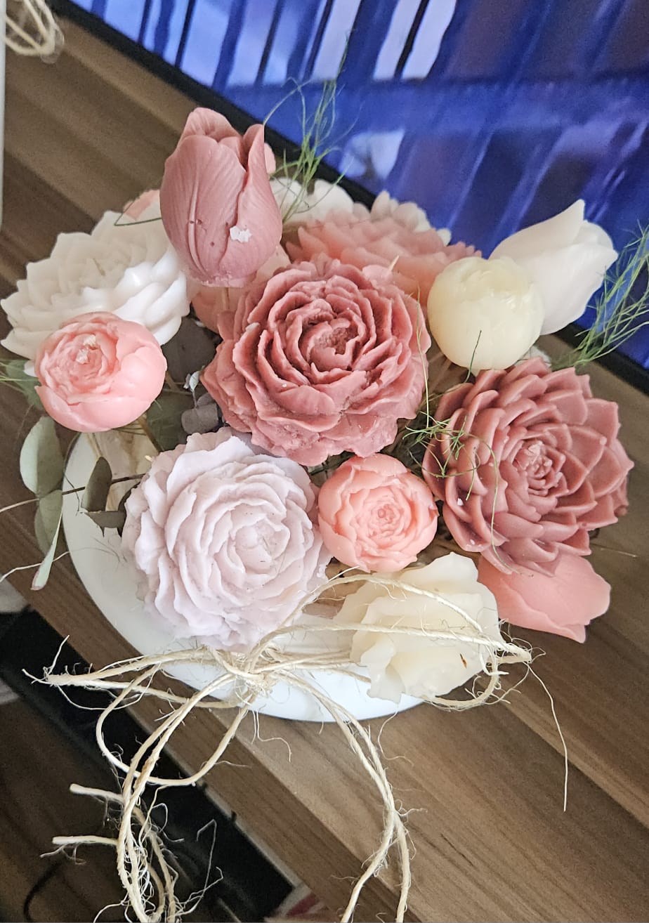 Dekoratif Çeşitli Renk, koku ve Desenlerde Çiçek Mumlar Aranjmanı